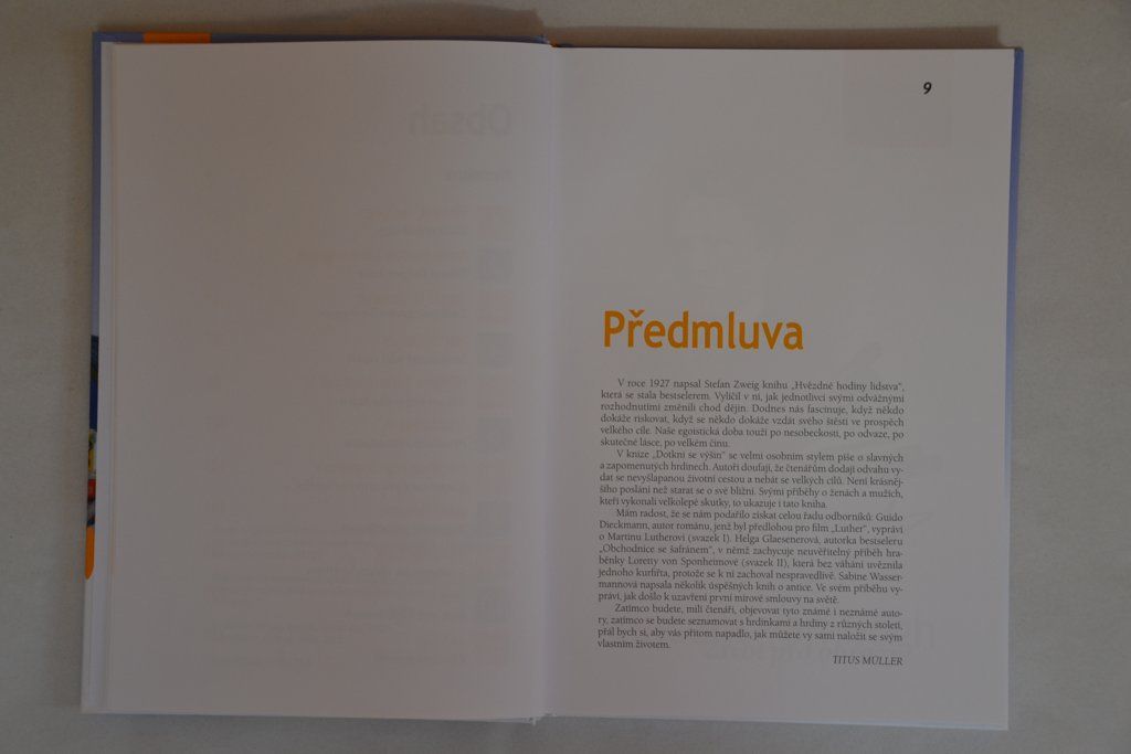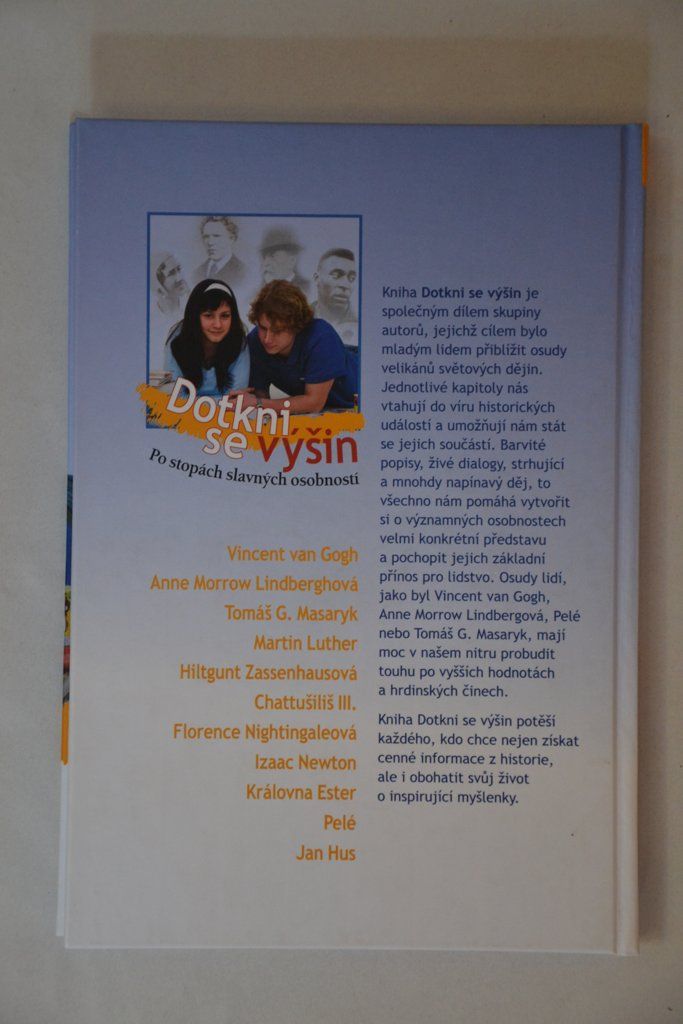 Kniha Dotkni se výšin je společným dílem skupiny autorů, jejichž cílem bylo mladým lidem přiblížit osudy velikánů světových dějin. Jednotlivé kapitoly nás vtahují do víru historických událostí a umožňují nám stát se jejich součástí. Barvité popisy, živé dialogy, strhující a mnohdy napínavý děj, to všechno nám pomáhá vytvořit si o významných osobnostech velmi konkrétní představu a pochopit jejich základní přínos pro lidstvo.